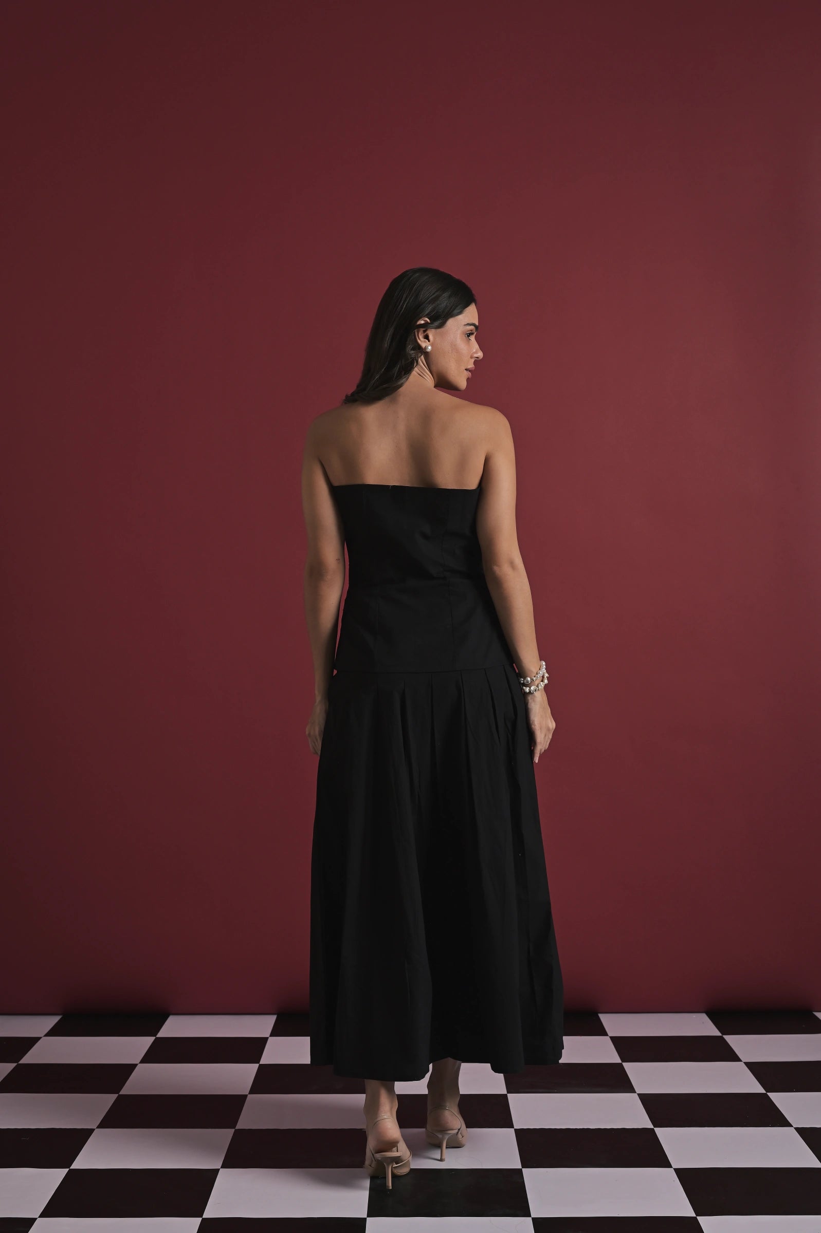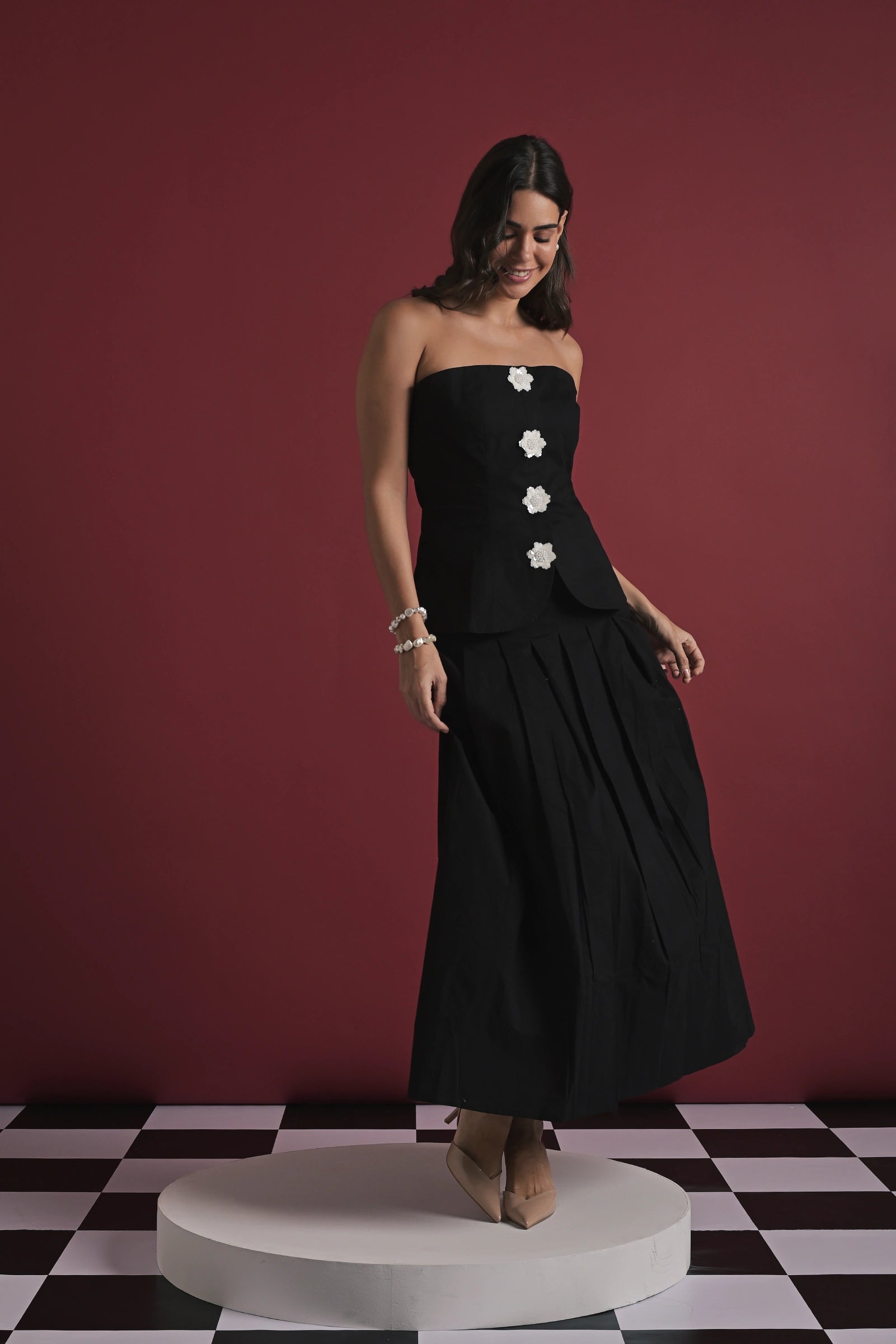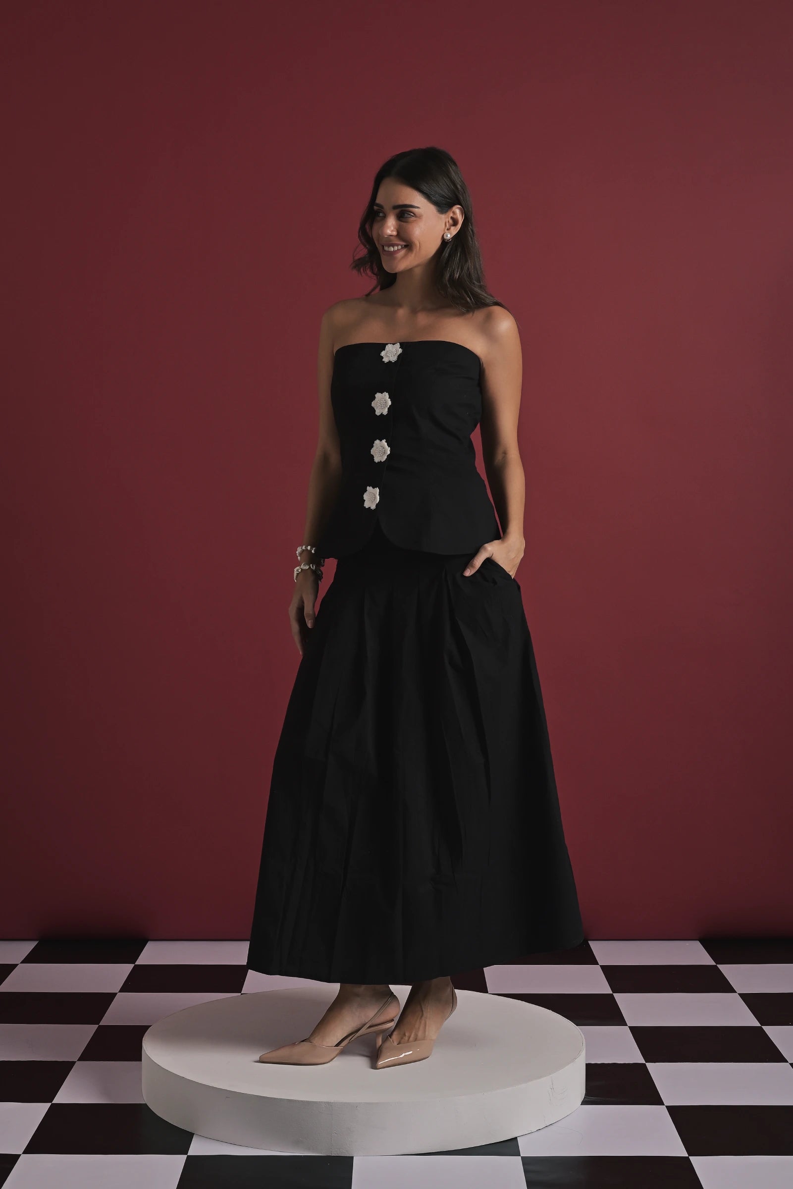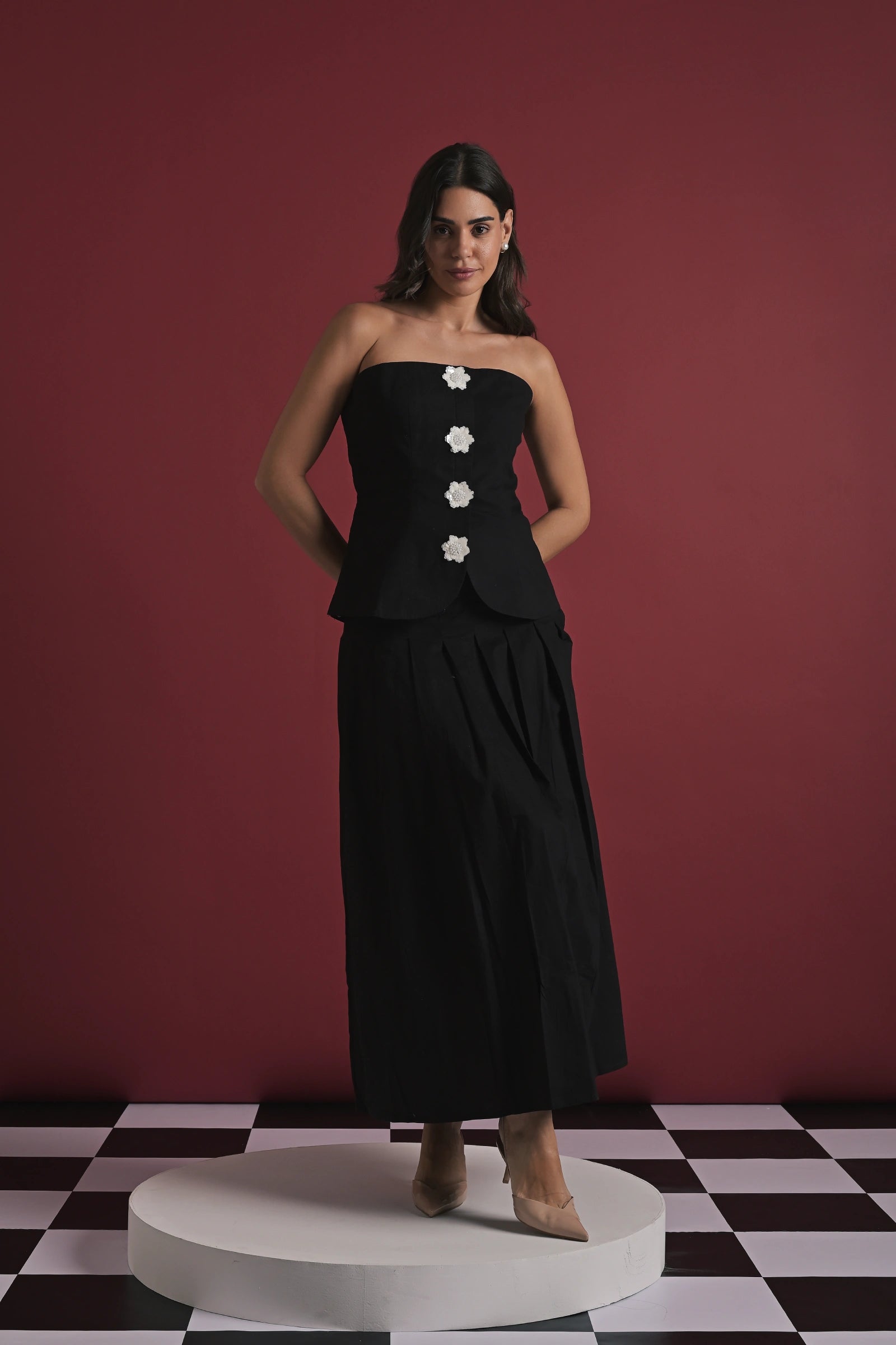 An elegant black strapless top paired with a flowy full-length skirt, creating a sleek and timeless silhouette. The top features statement floral appliqué buttons down the front, adding a subtle yet striking detail, while the structured bodice balances beautifully with the soft drape of the skirt. Effortlessly refined and versatile, this set works perfectly for evening affairs or elevated daytime looks. Shown on a model wearing size XS, with a height of 5'7”.