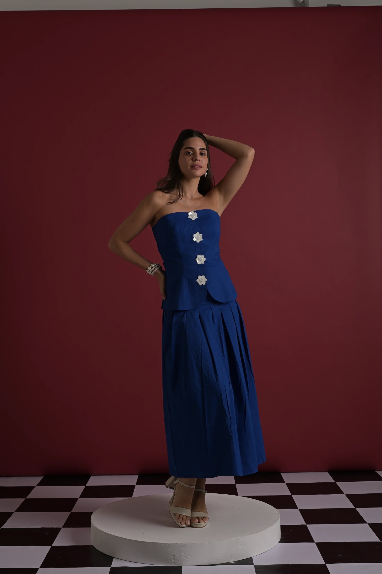 An elegant blue strapless top paired with a flowy full-length skirt, creating a sleek and timeless silhouette. The top features statement floral appliqué buttons down the front, adding a subtle yet striking detail, while the structured bodice balances beautifully with the soft drape of the skirt. Effortlessly refined and versatile, this set works perfectly for evening affairs or elevated daytime looks. Shown on a model wearing size XS, with a height of 5'7”.