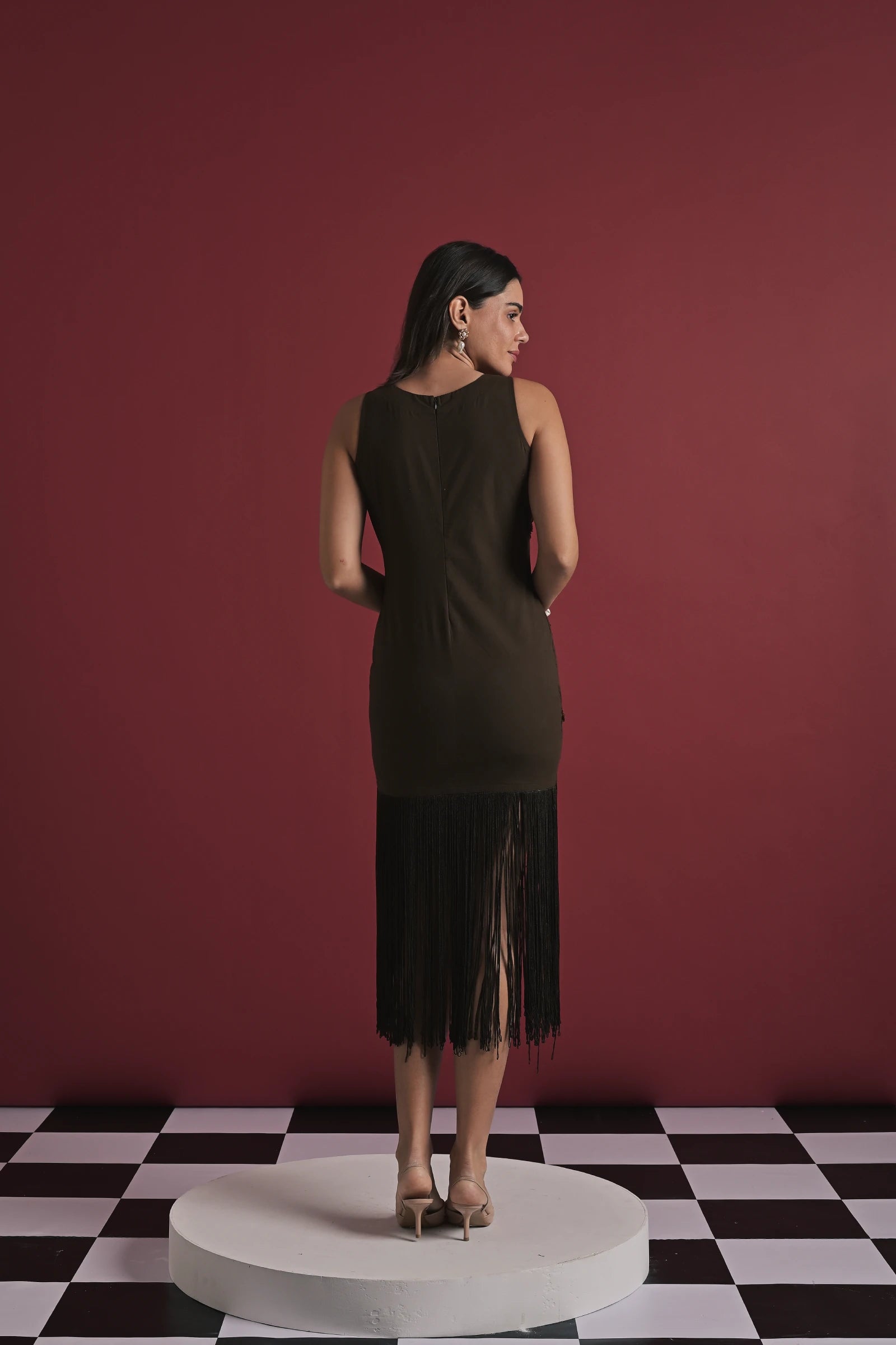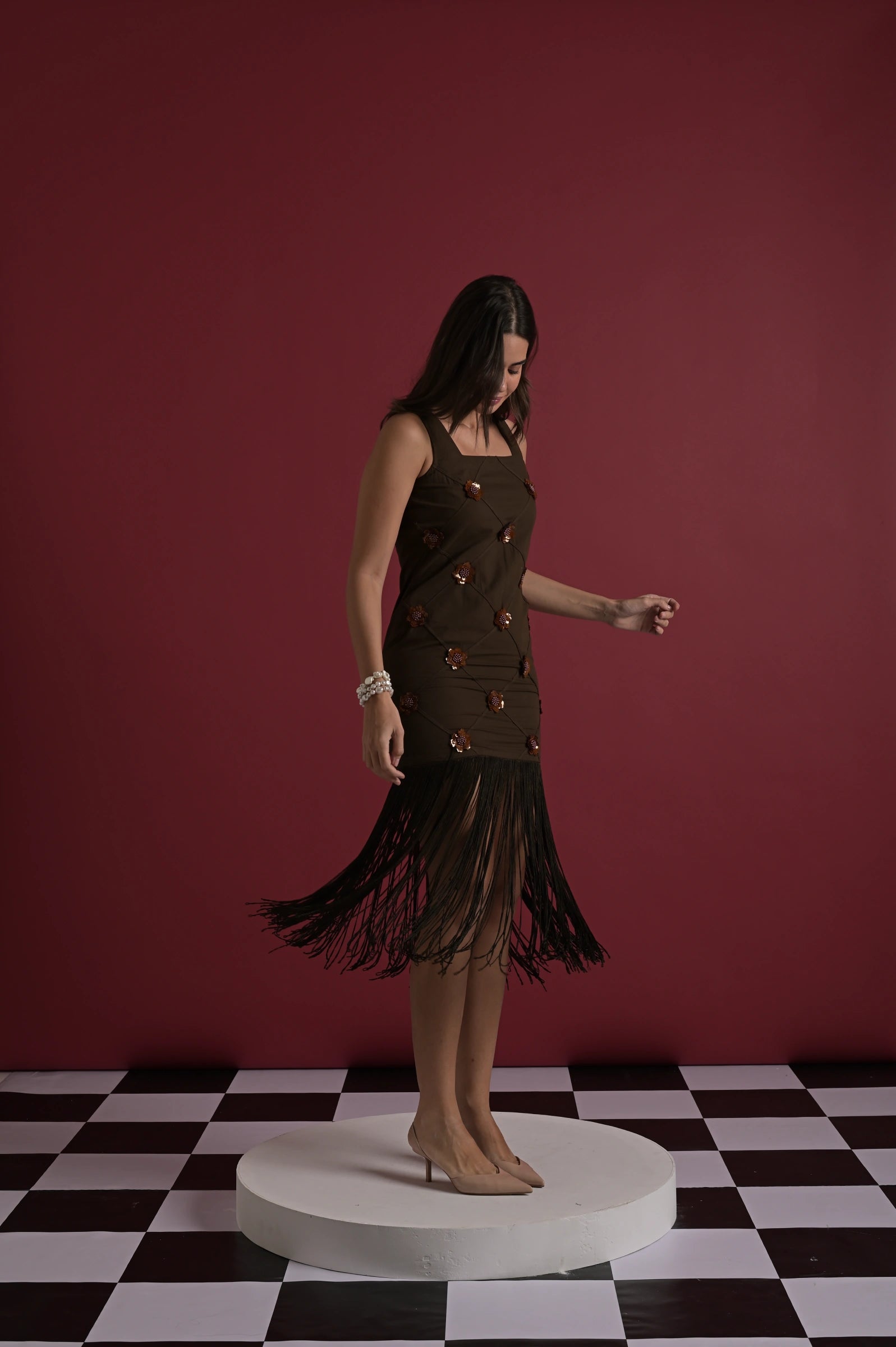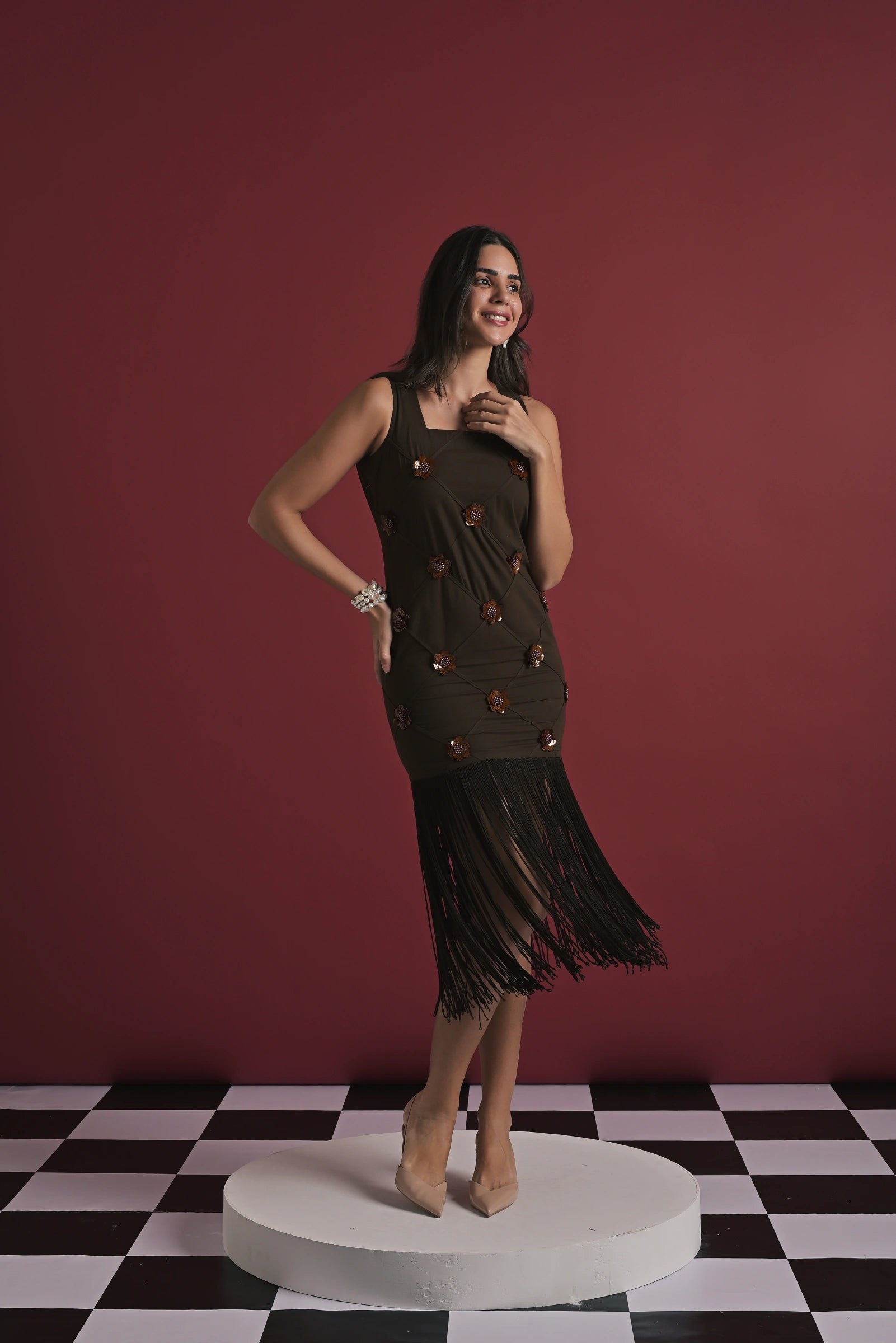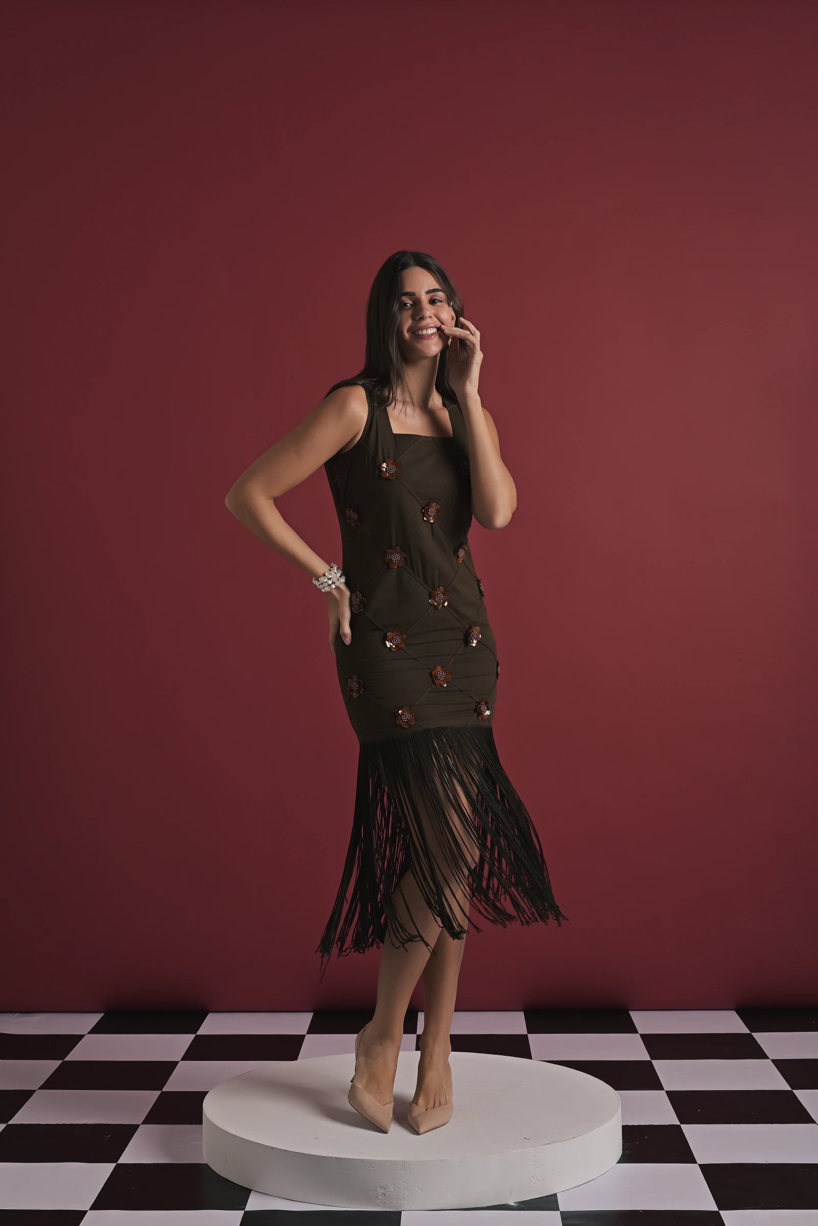 The model is wearing a brown cotton dress adorned with delicate white floral appliqué detailing and a statement fringed hem that adds movement and elegance. Styled against a rich maroon backdrop, the outfit exudes a chic, modern charm. The model is wearing a size XS and stands at 5'9", showcasing the fit and flow of the silhouette beautifully.
