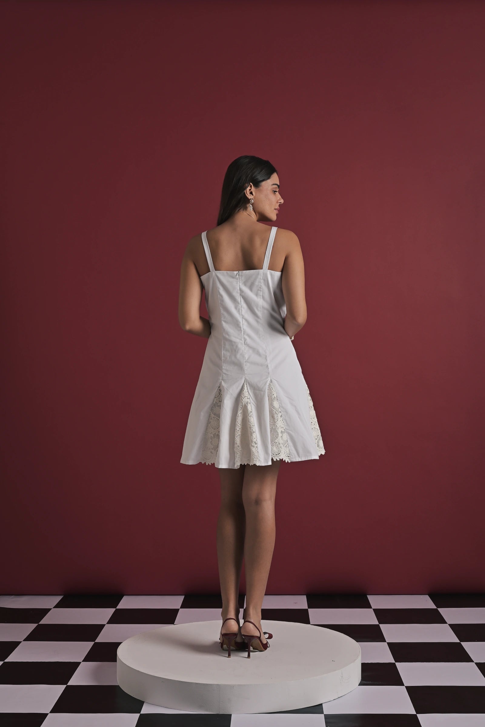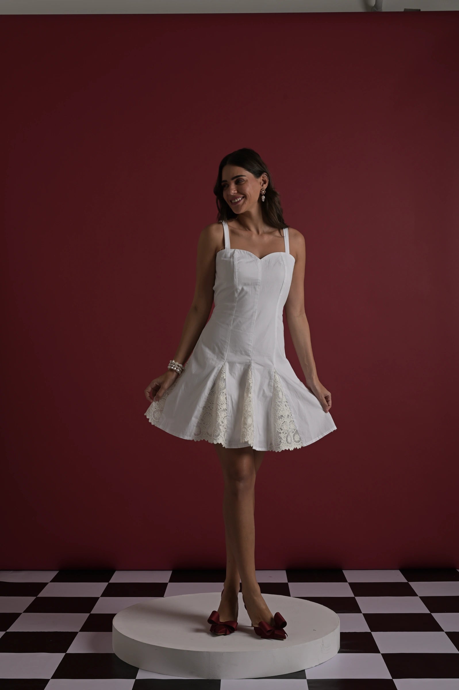 The model is wearing a brown cotton dress adorned with delicate white floral appliqué detailing and a statement fringed hem that adds movement and elegance. Styled against a rich maroon backdrop, the outfit exudes a chic, modern charm. The model is wearing a size XS and stands at 5'9", showcasing the fit and flow of the silhouette beautifully.