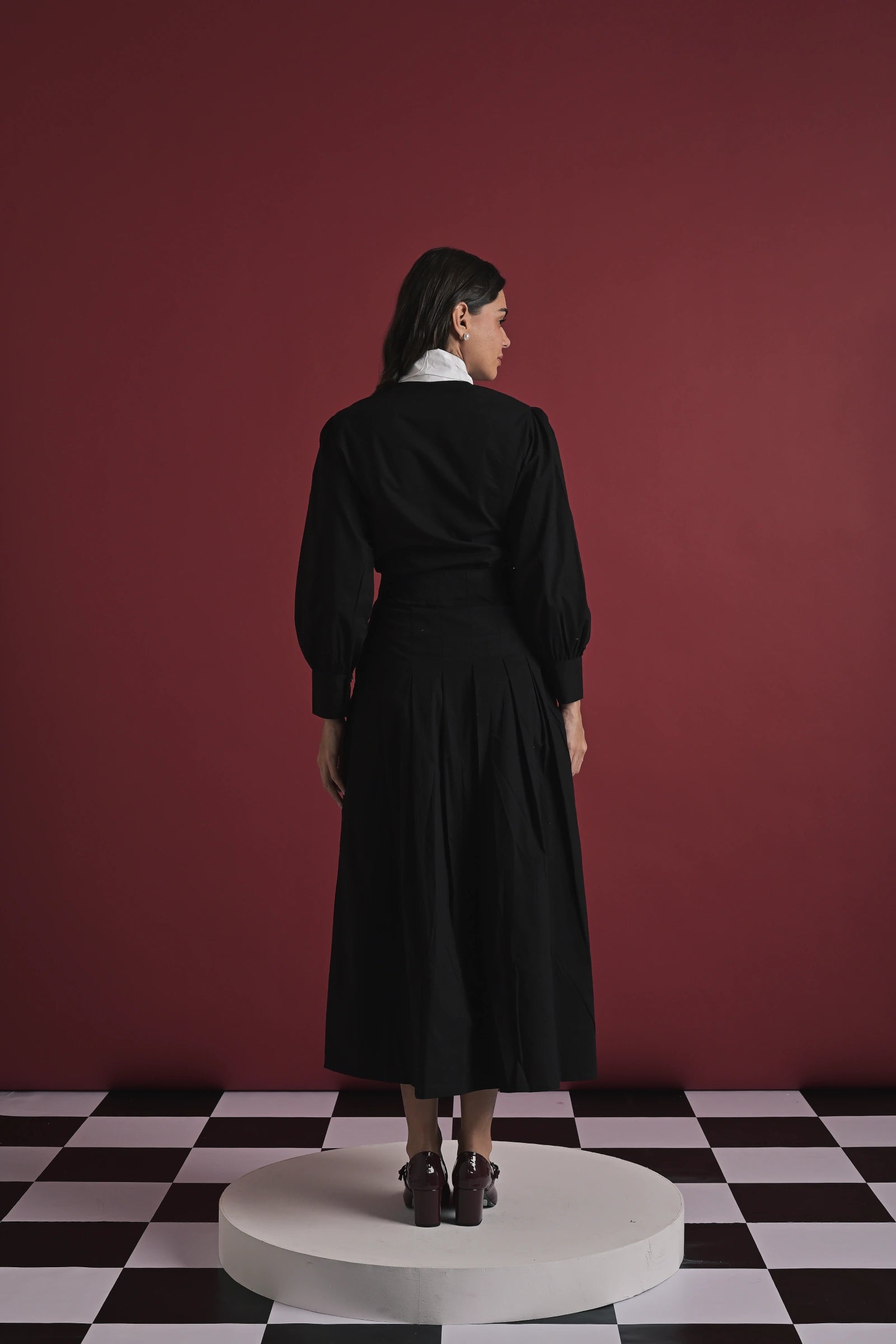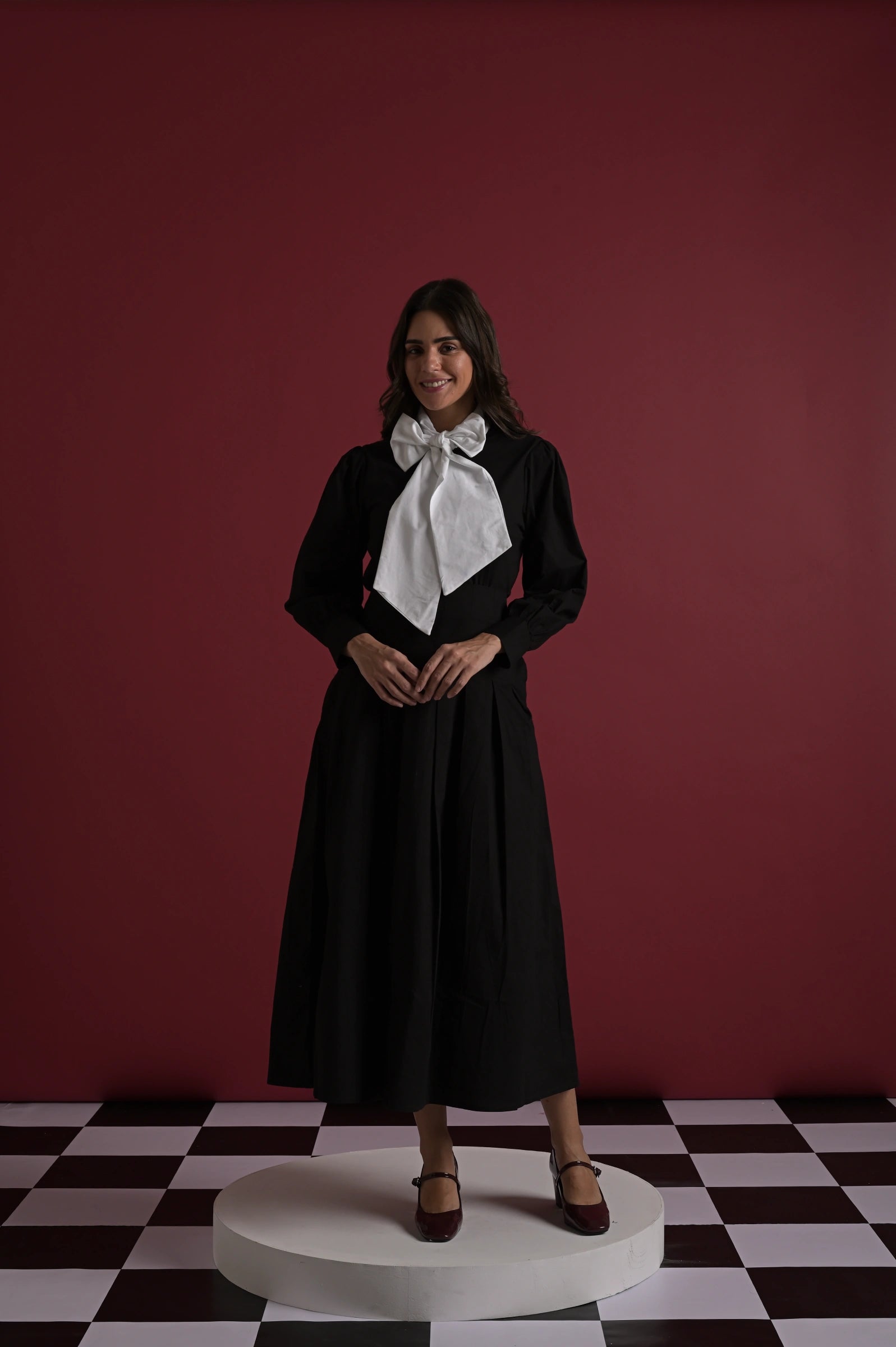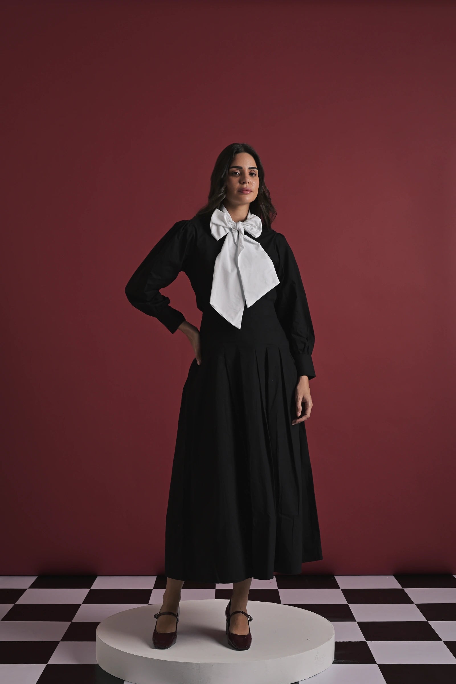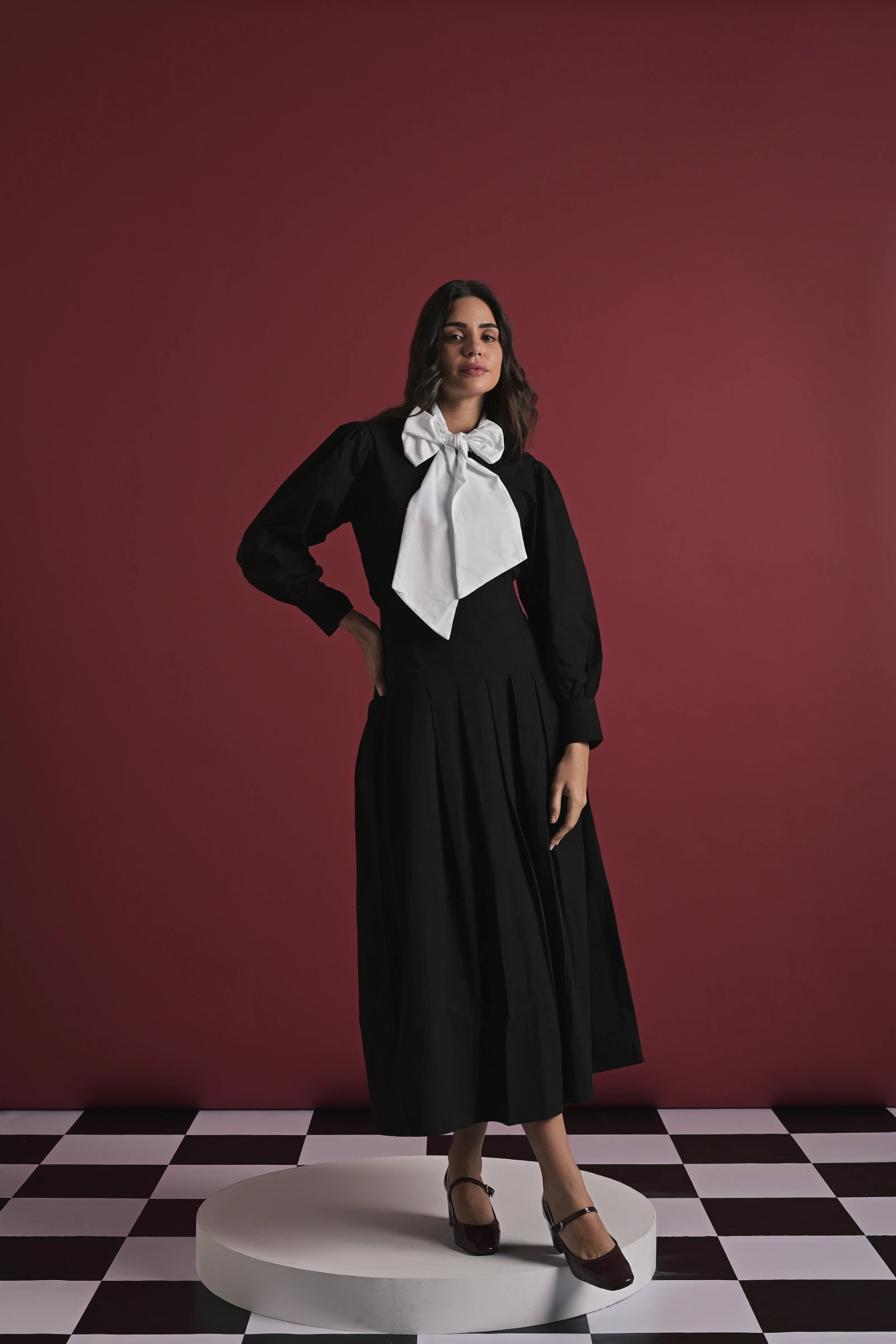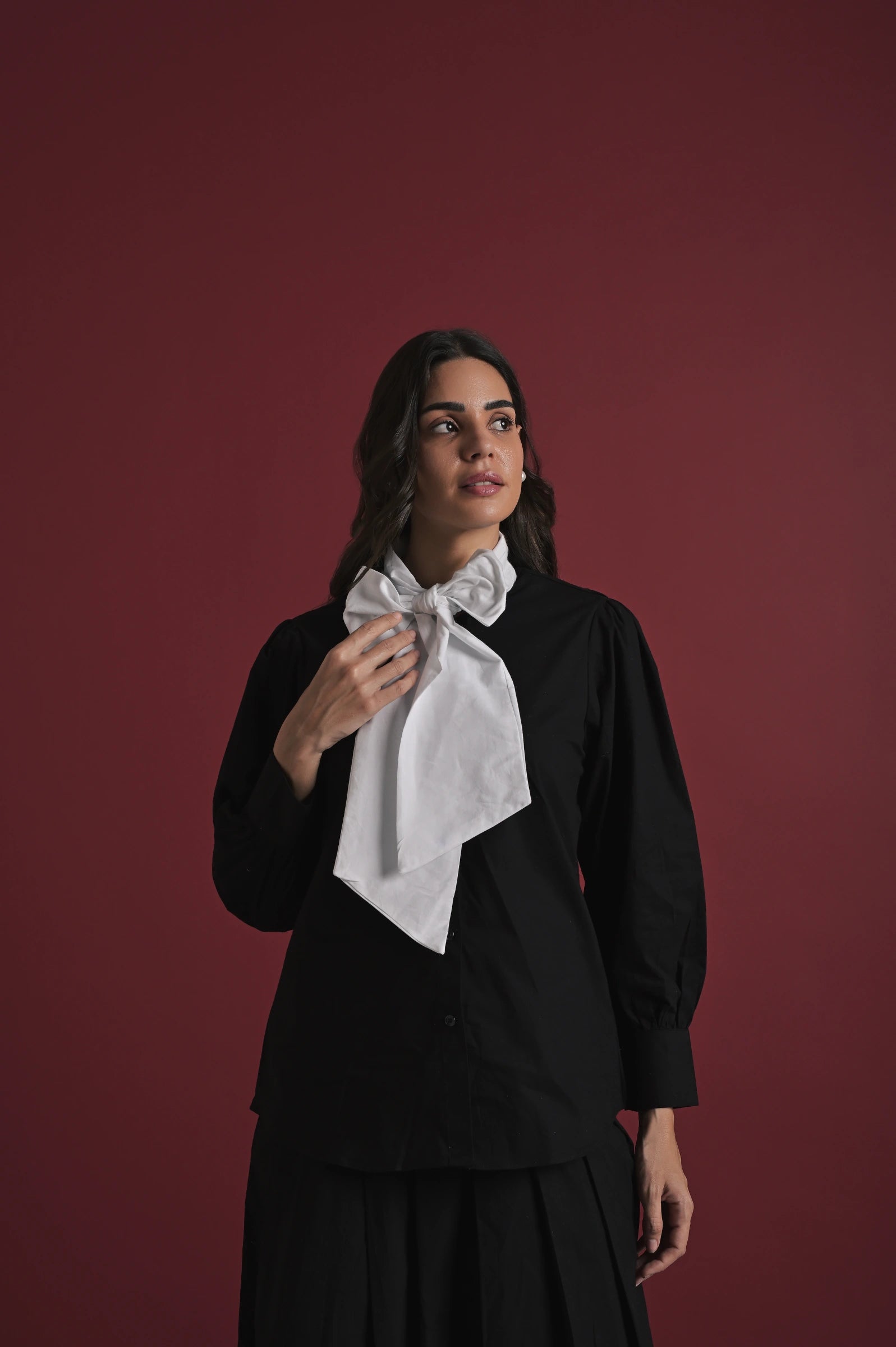 A chic two-piece set crafted for refined elegance. The black full-sleeve top features an exaggerated white statement bow at the neckline, adding a bold and feminine touch. Paired with a matching black midi skirt designed with soft pleats and a flowy silhouette, this set brings effortless sophistication to any outing—perfect for dinners, events, or elevated daywear.