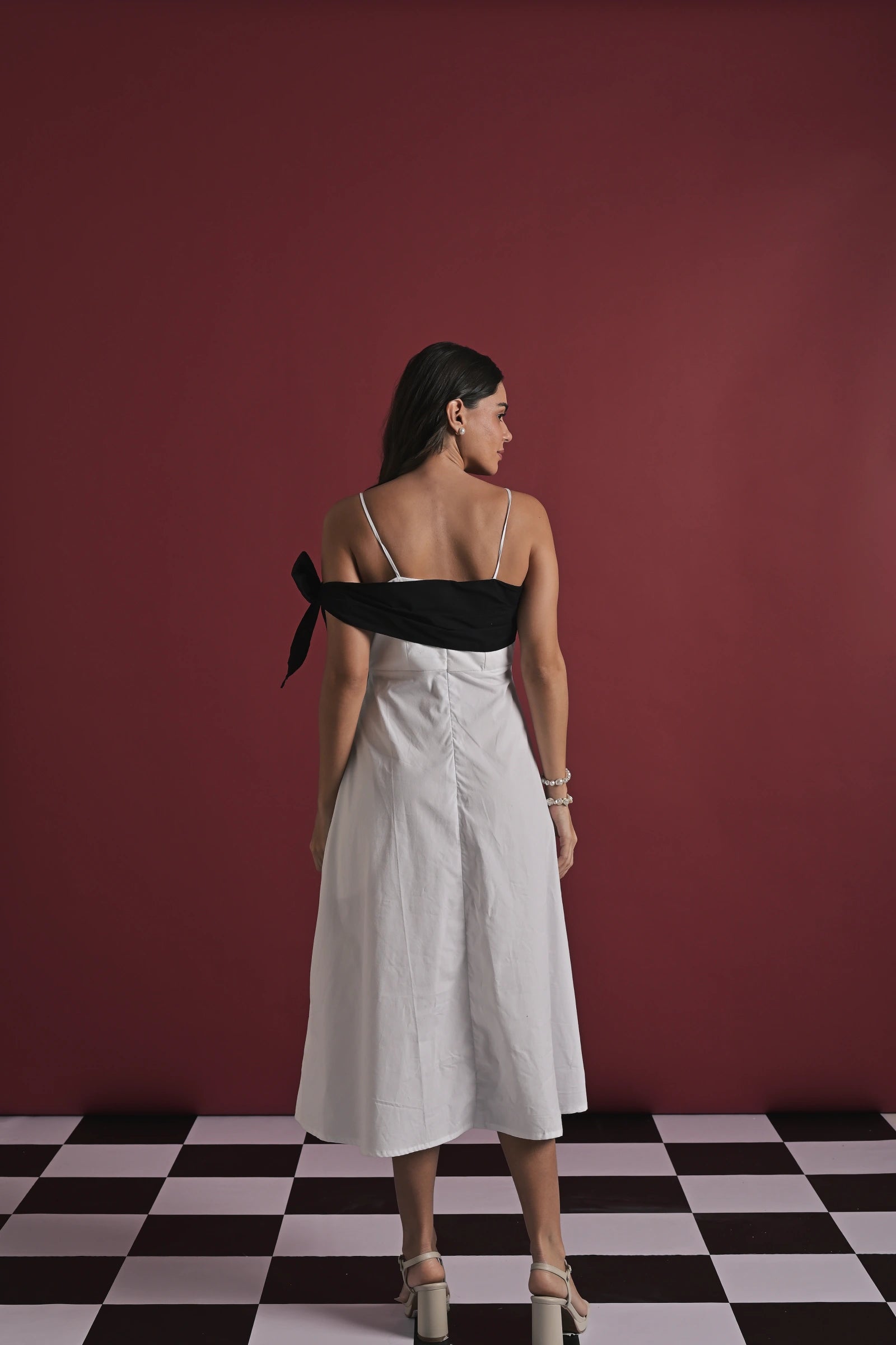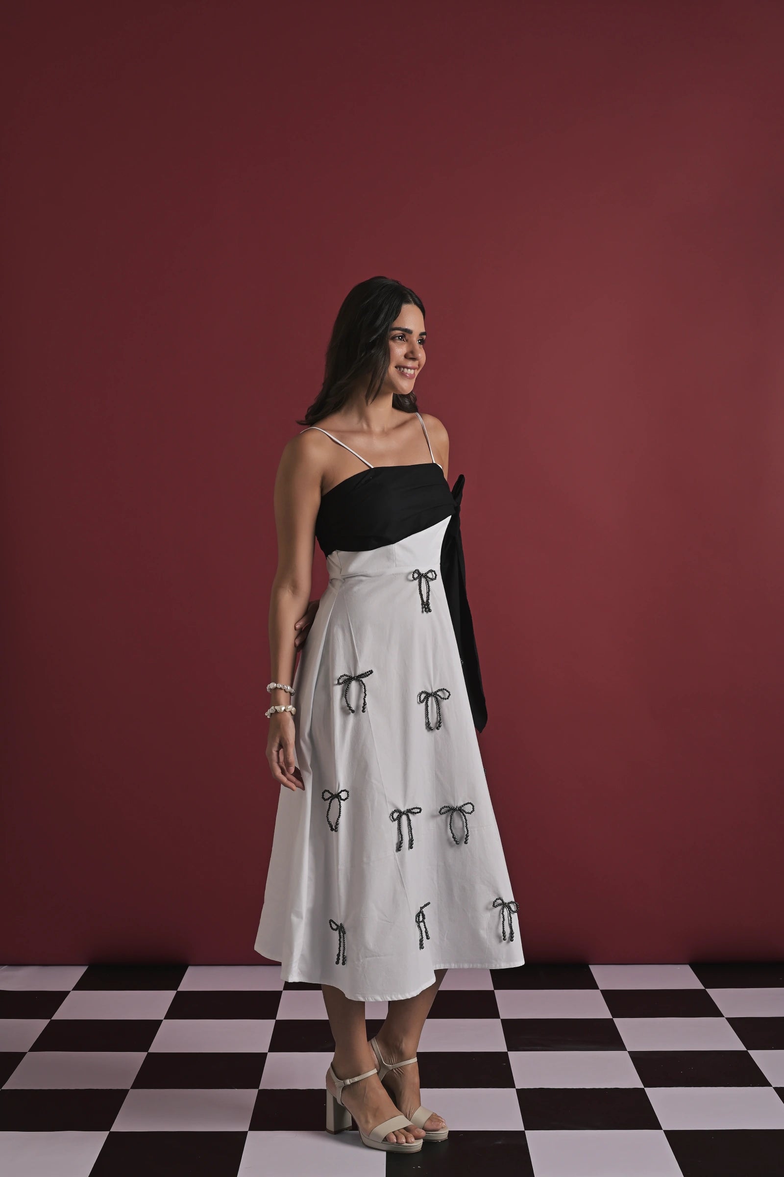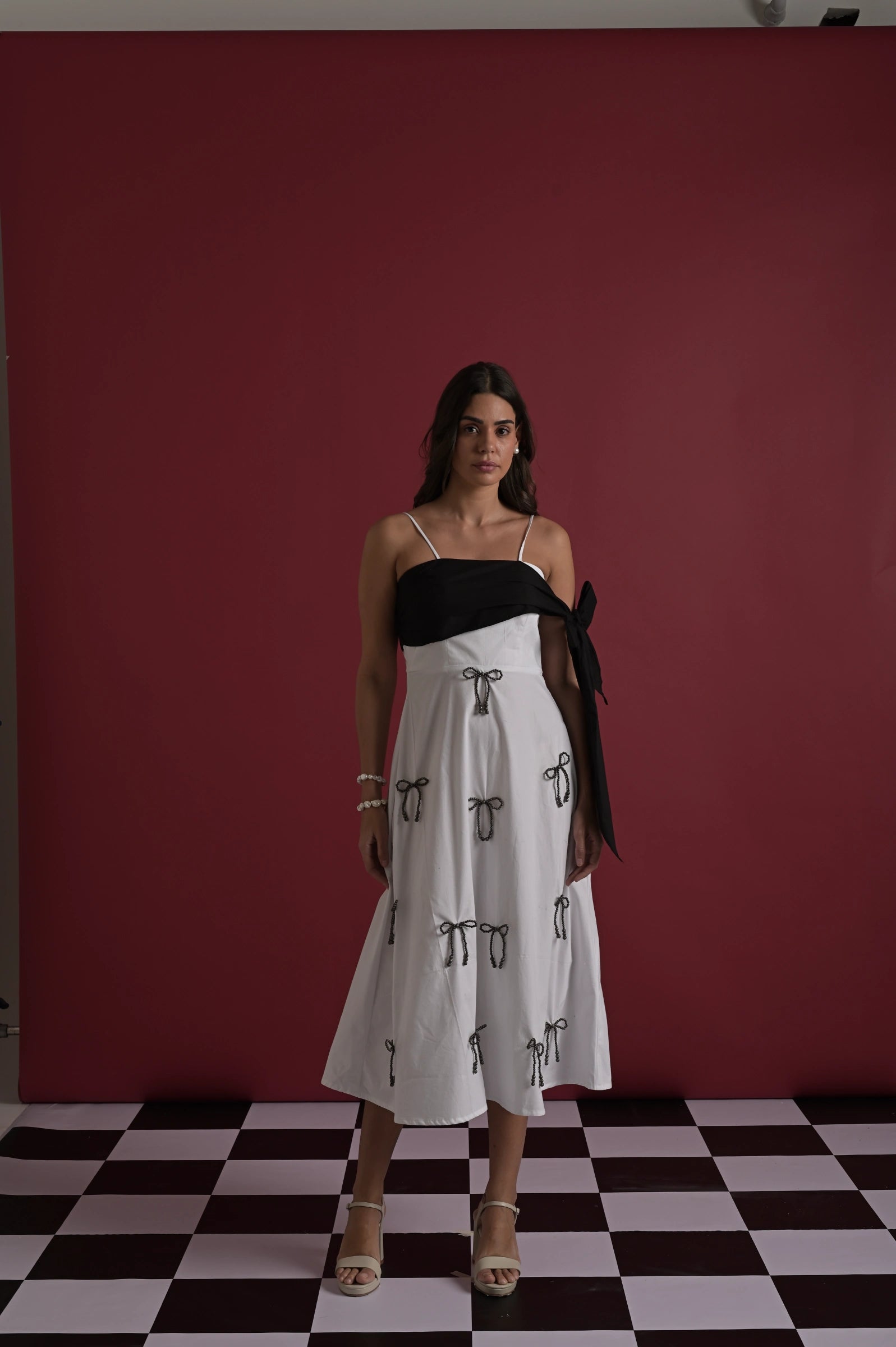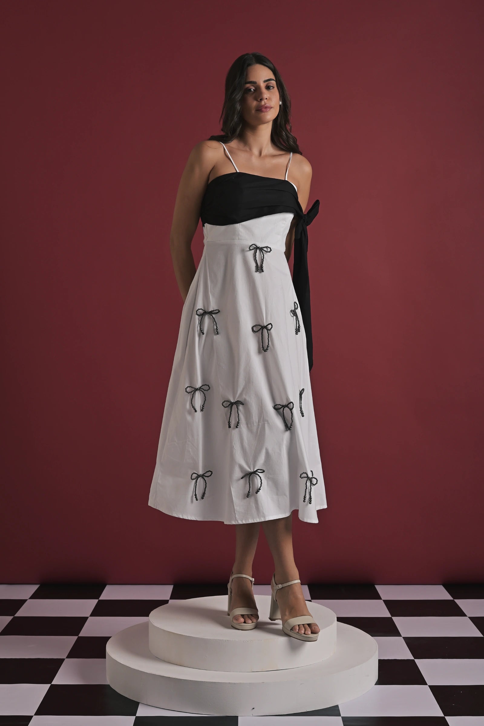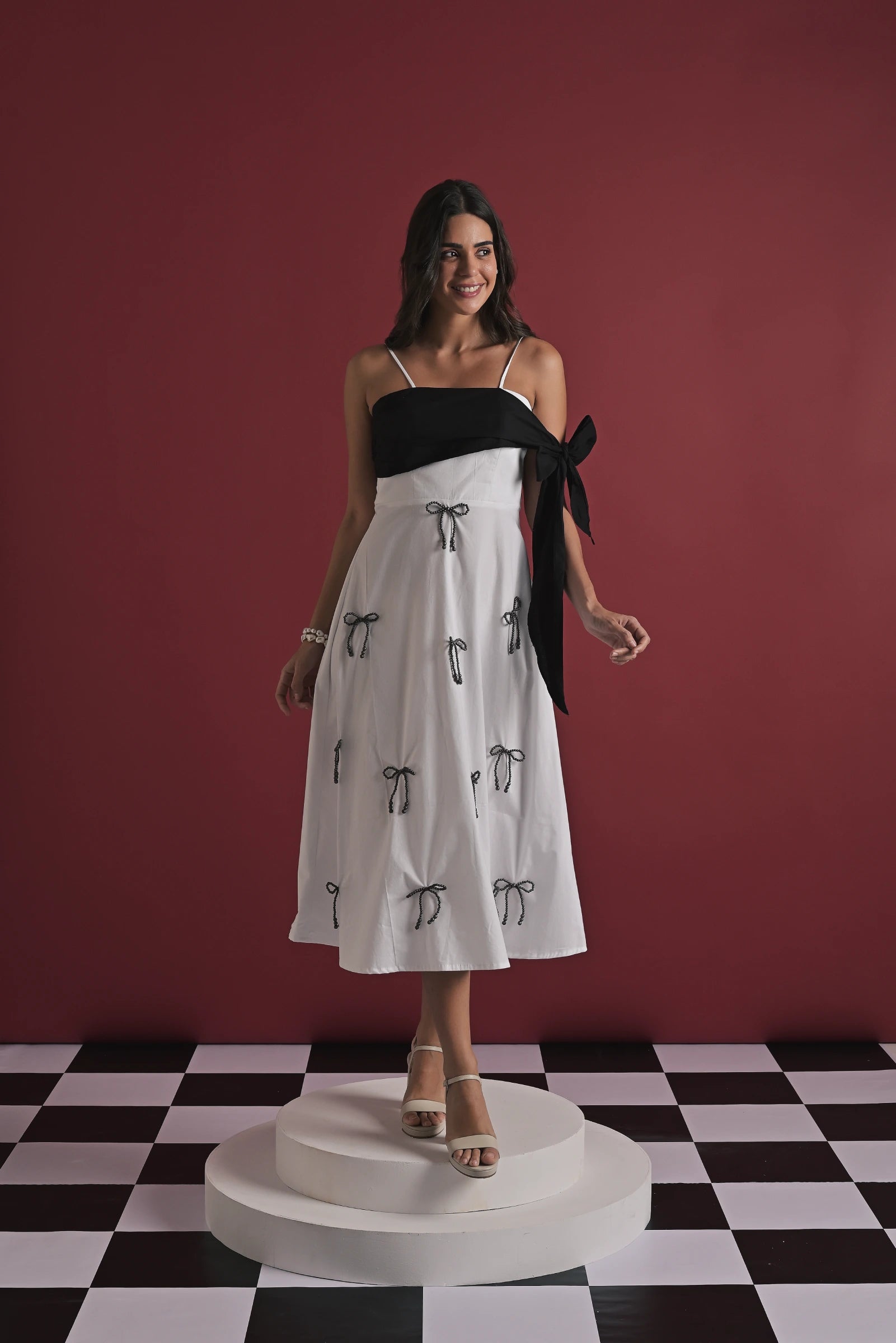 A statement white midi dress designed with playful handcrafted charm. The dress features delicate spaghetti straps, a contrast black draped bust detail that ties into a bold side bow, and scattered white rope-tie embellishments throughout the skirt for a unique, signature touch. Effortlessly feminine yet contemporary, this piece is perfect for brunches, get-togethers, or standout evening styling.