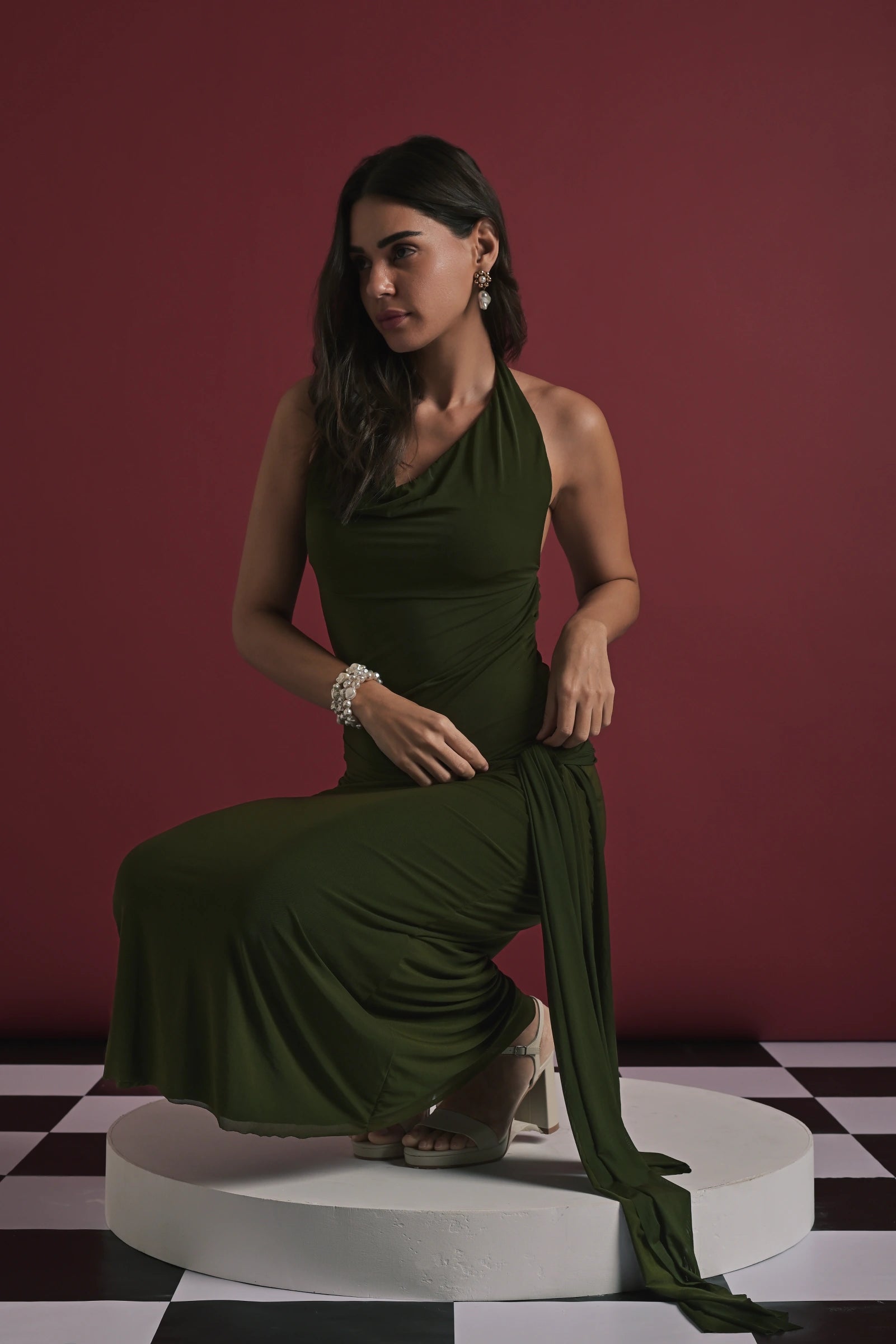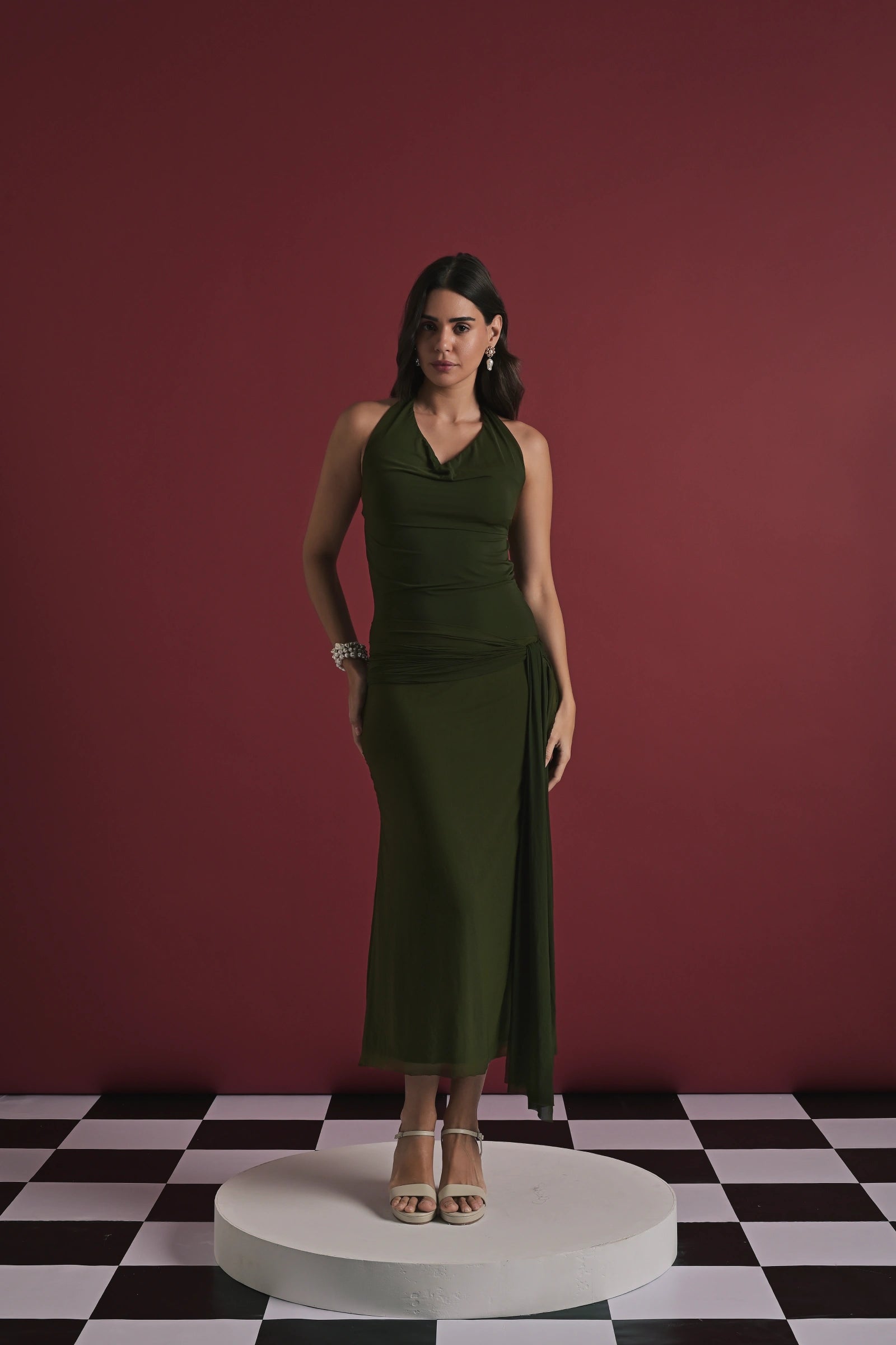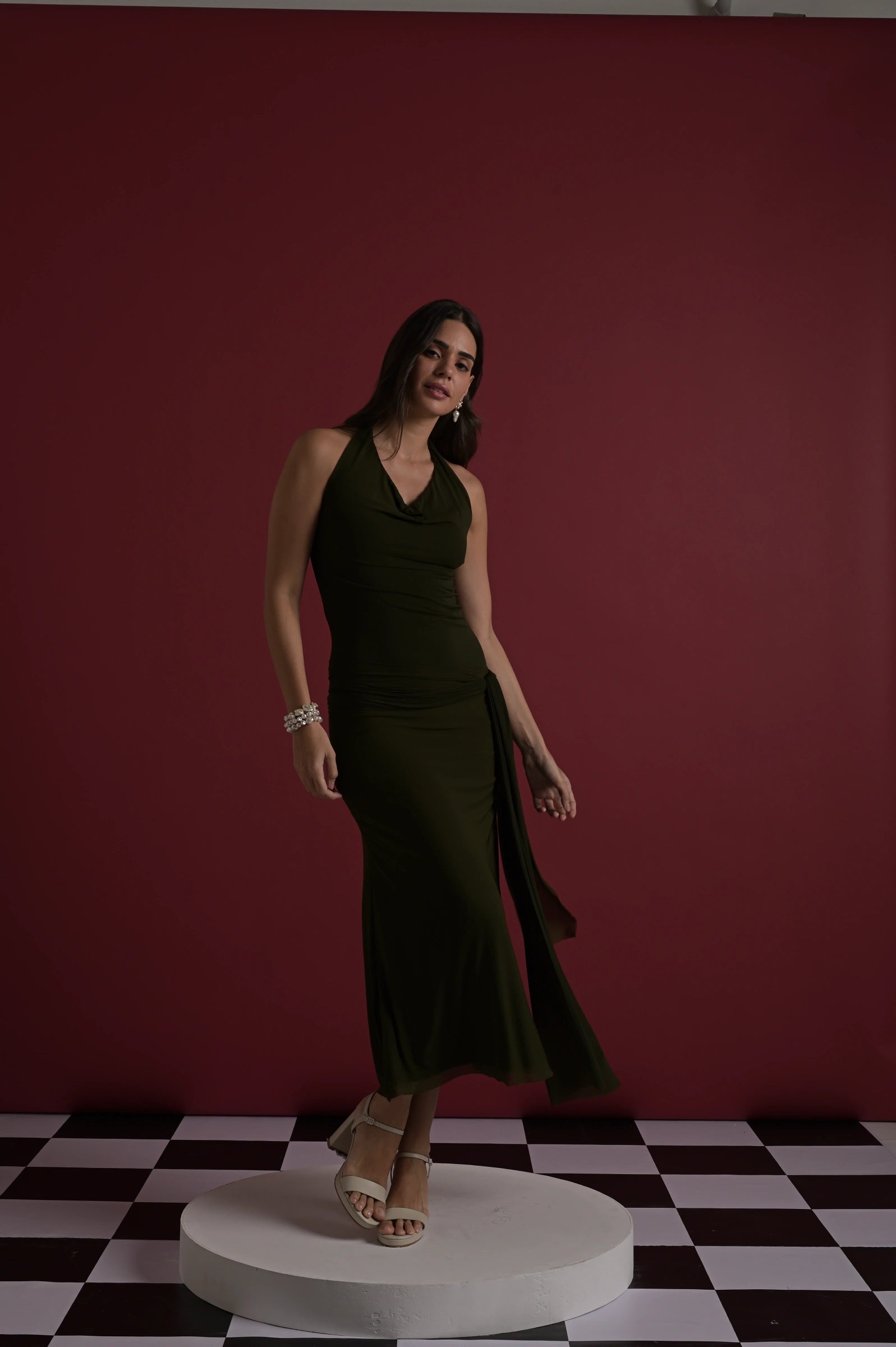 This olive-green halter gown exudes effortless glamour with its draped cowl neckline, cinched waist detailing, and fluid side drape. Crafted in a stretchable net and lycra blend for a sculpted yet comfortable fit, it elevates minimal elegance with a refined silhouette. Model is wearing size XS and stands 5'9 ft tall.