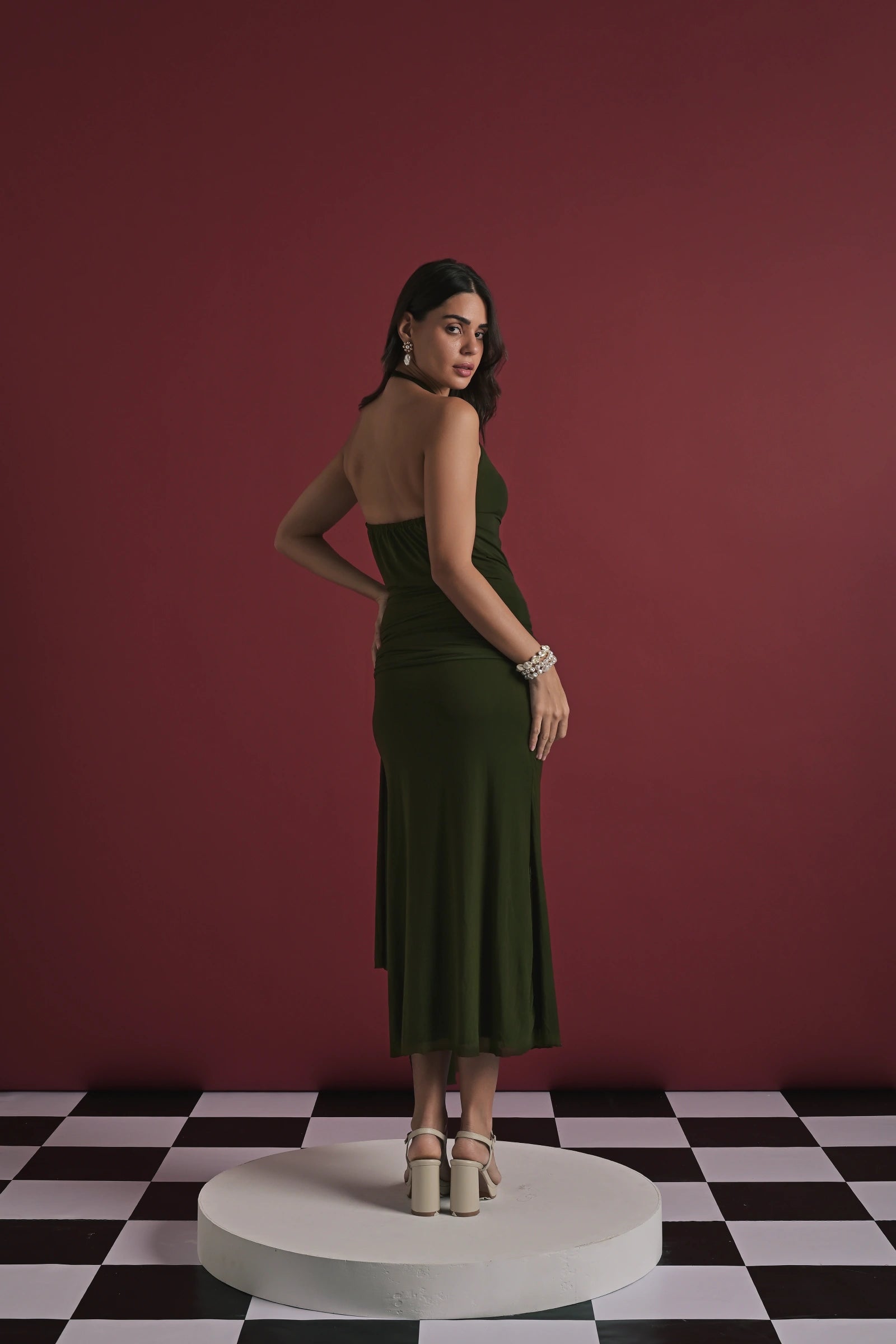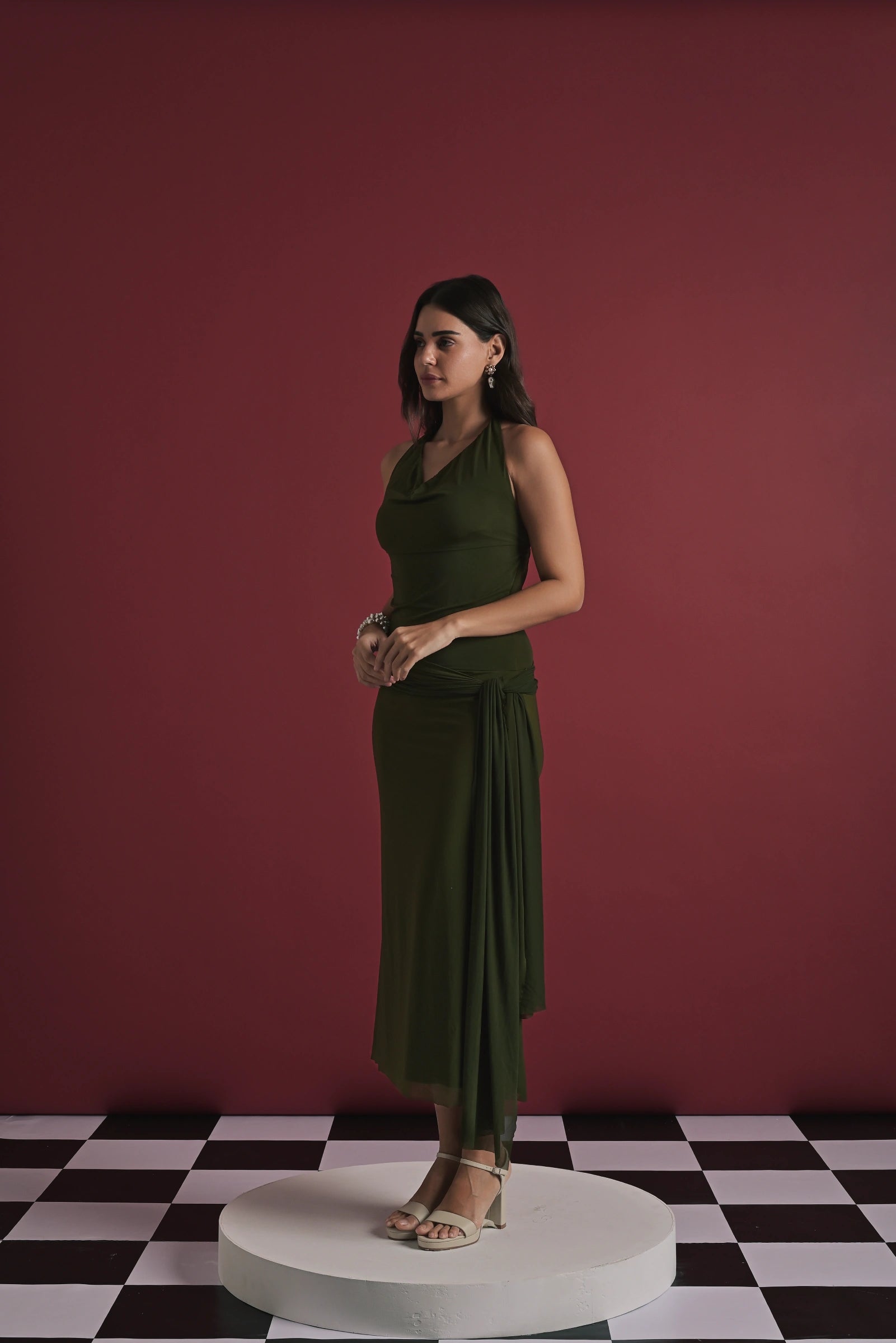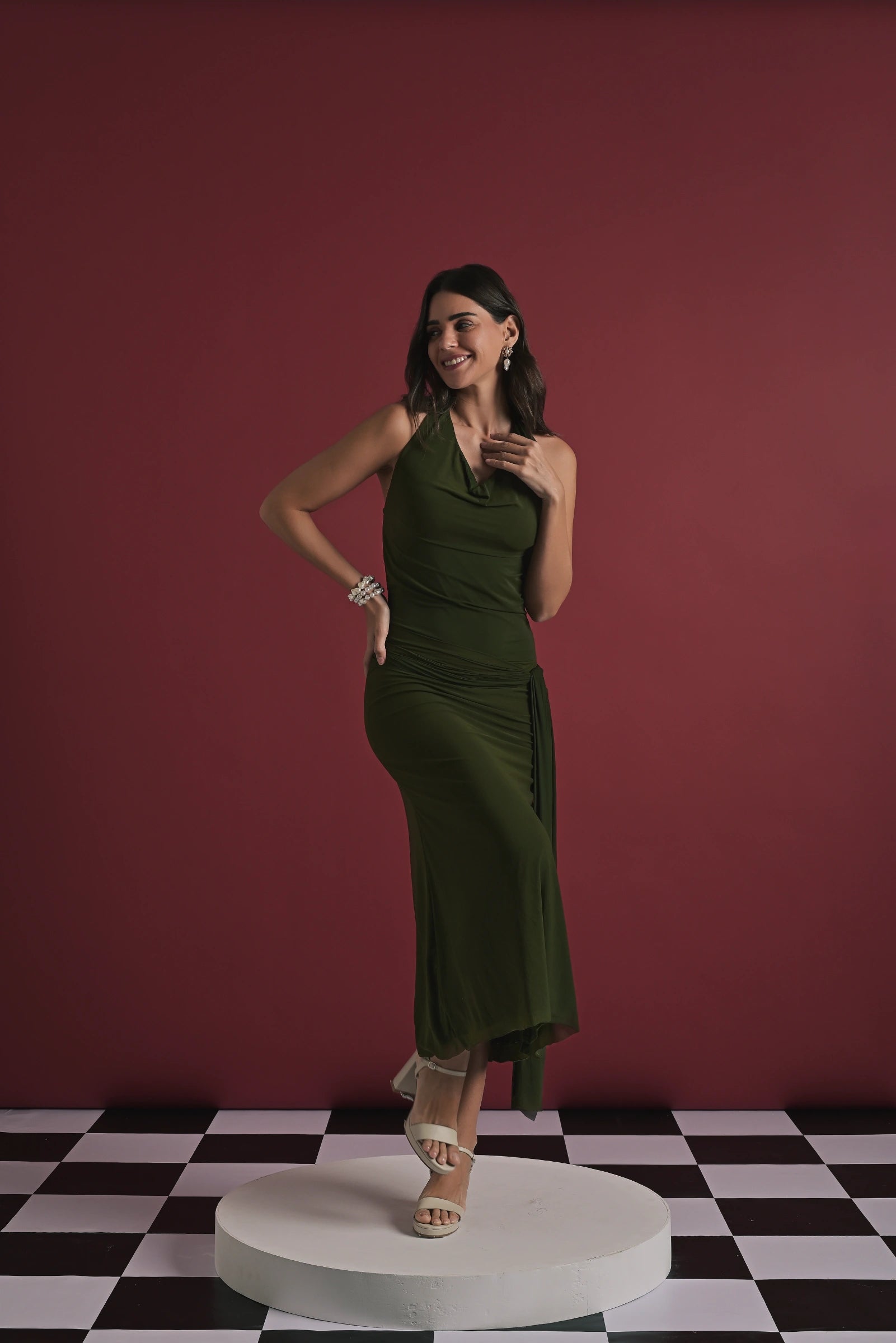 This olive-green halter gown exudes effortless glamour with its draped cowl neckline, cinched waist detailing, and fluid side drape. Crafted in a stretchable net and lycra blend for a sculpted yet comfortable fit, it elevates minimal elegance with a refined silhouette. Model is wearing size XS and stands 5'9 ft tall.