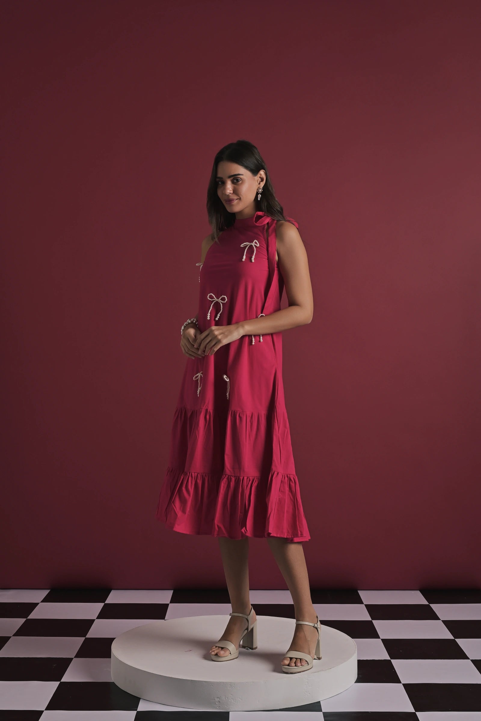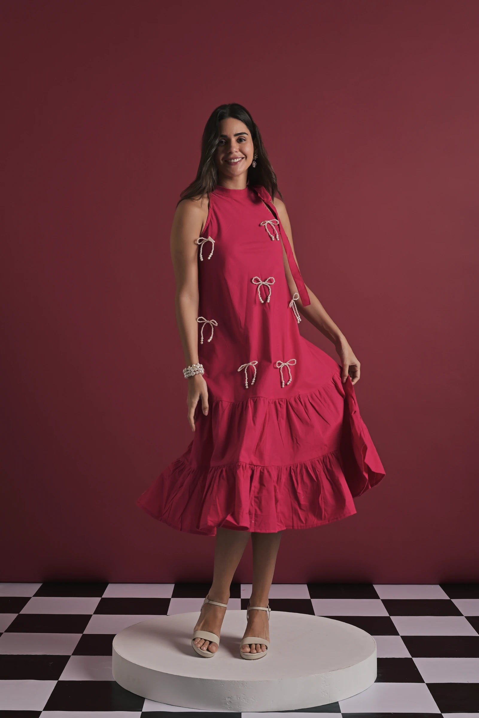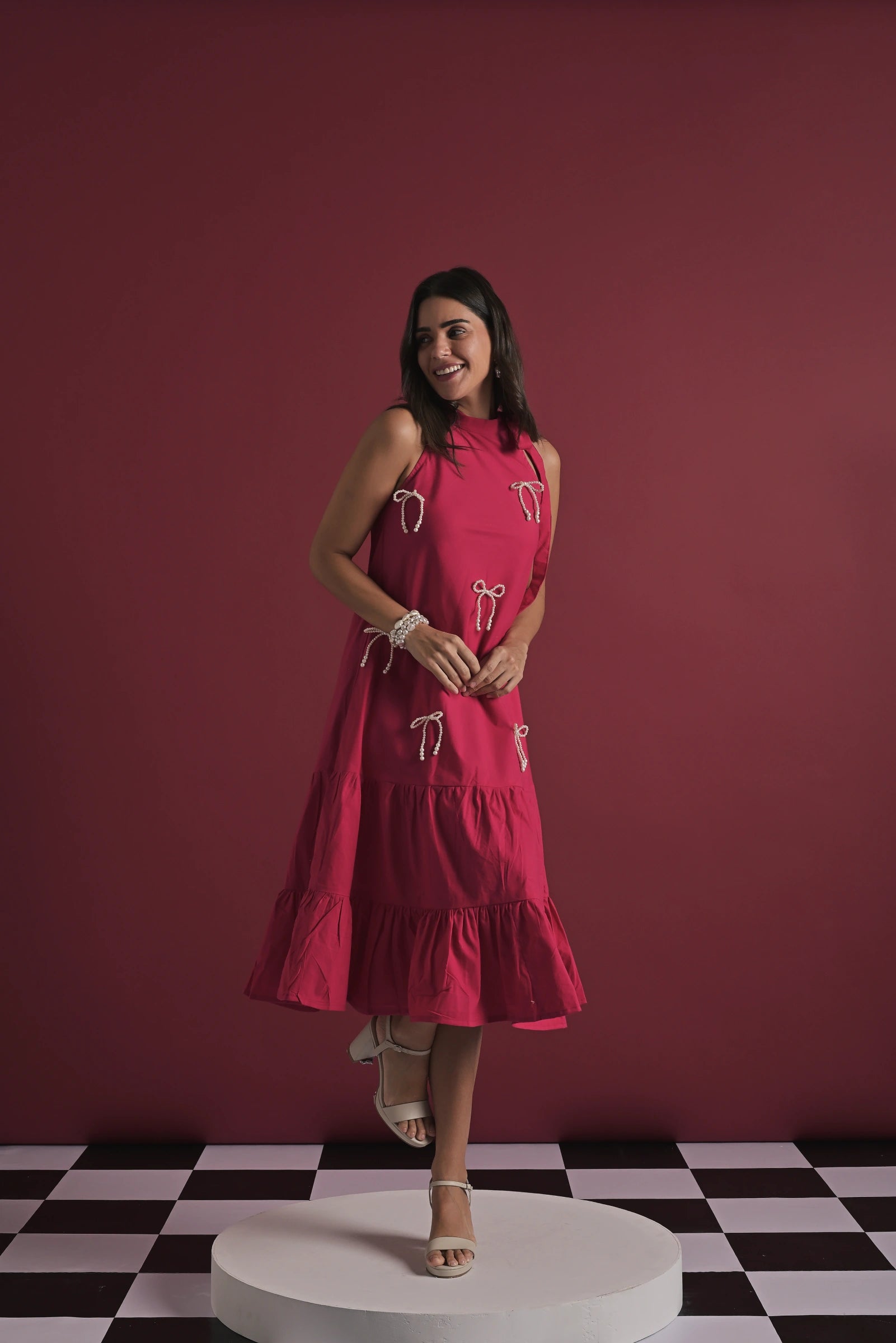 A chic fuschia pink midi dress featuring a relaxed A-line silhouette, elevated with delicate bow embellishments that add a playful yet refined touch. Designed with a sleeveless high neckline and a softly flared hem, it strikes the perfect balance between elegance and ease—ideal for day-to-evening styling. The look is presented on a model wearing size XS, with a height of 5'7”.