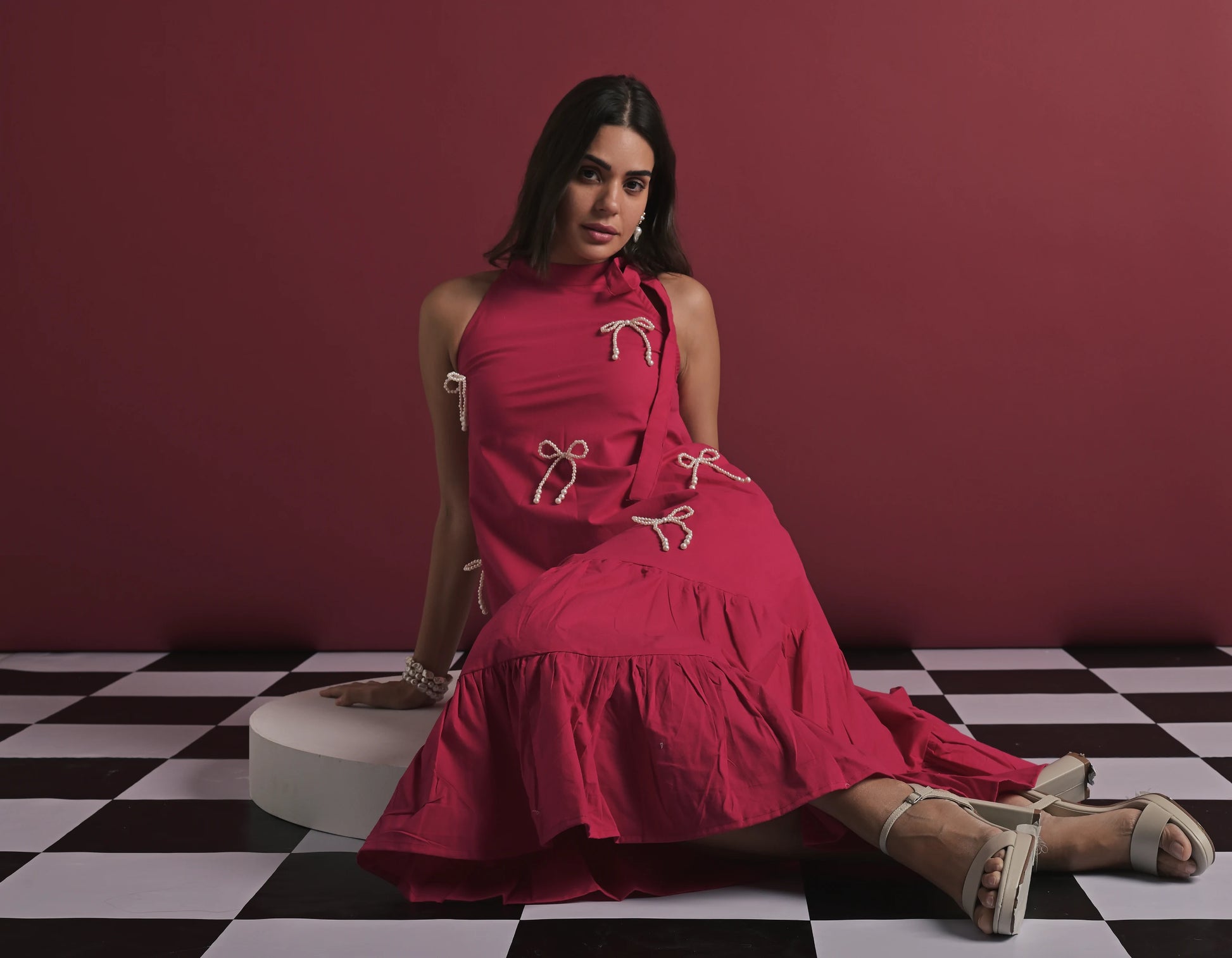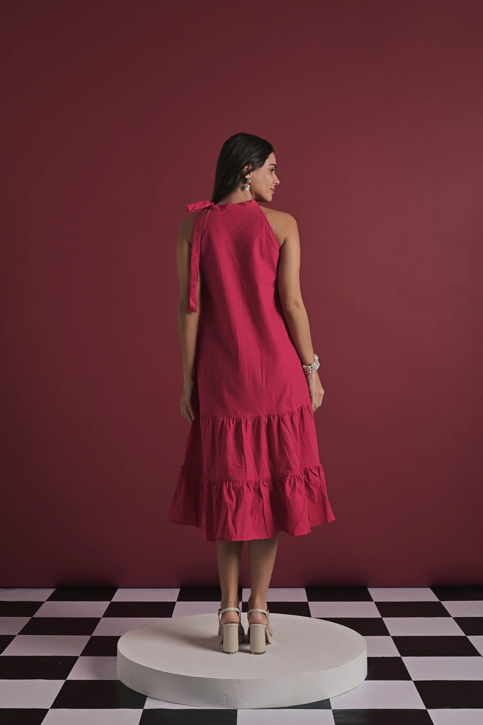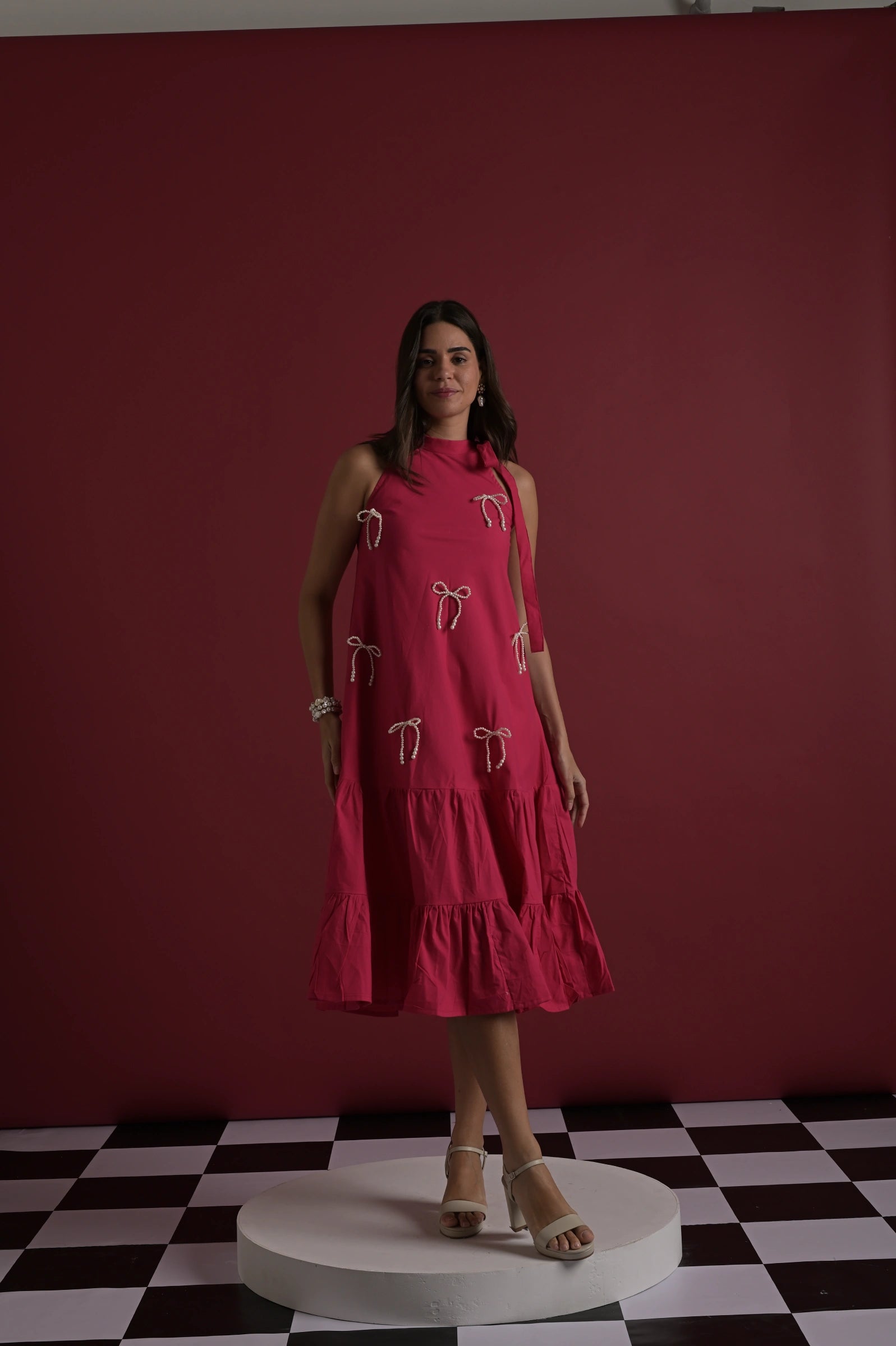 A chic fuschia pink midi dress featuring a relaxed A-line silhouette, elevated with delicate bow embellishments that add a playful yet refined touch. Designed with a sleeveless high neckline and a softly flared hem, it strikes the perfect balance between elegance and ease—ideal for day-to-evening styling. The look is presented on a model wearing size XS, with a height of 5'7”.