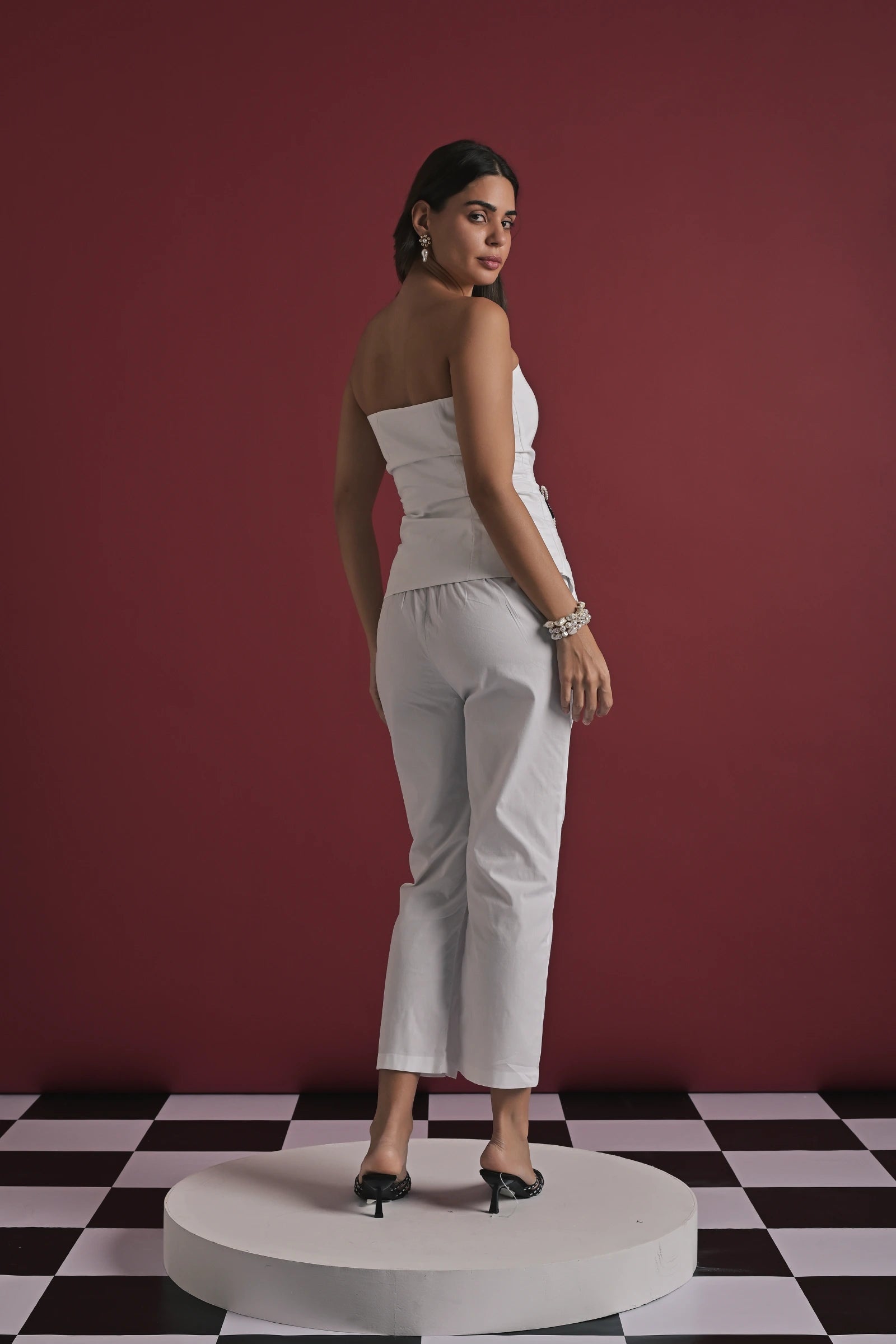 Step into effortless elegance with this chic white strapless jumpsuit, designed with structured detailing for a flattering silhouette. Featuring a button-down front, contrast black paneling, and dual statement buckle accents at the waist, this piece blends modern tailoring with bold design. The tapered ankle-length fit keeps the look sleek and refined, perfect for both day and evening styling.